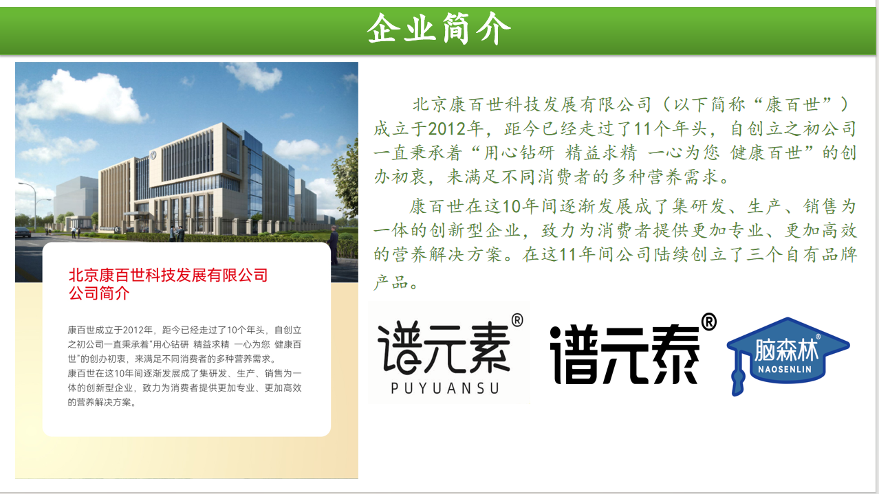 北京康百世科技发展有限公司是一家集研发、生产、销售于一体高新技术企业。在北京大兴生物医药基地投资建设了3条智能化生产线,粉剂型的所有包装形式及规格均能高标准生产,产能充足,生产车间按照10万级洁净级别建设,24小时恒温,恒湿,产品质量稳定可靠。现有谱元素,谱元泰,脑森林三个品牌,分别覆盖医疗养老,特殊渠道和电商平台。