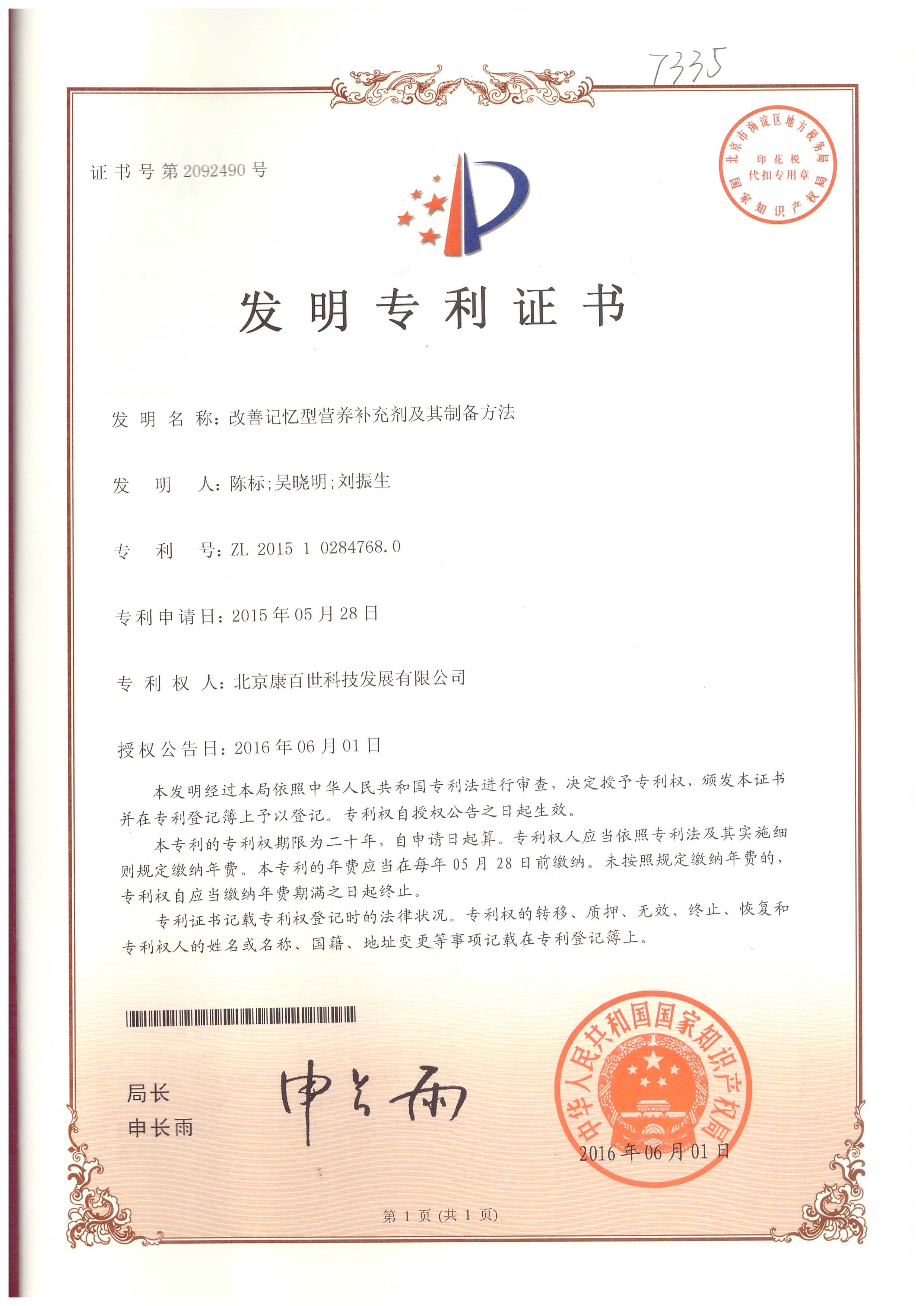 发明专利证书-改善记忆型营养补充剂及其制备方法